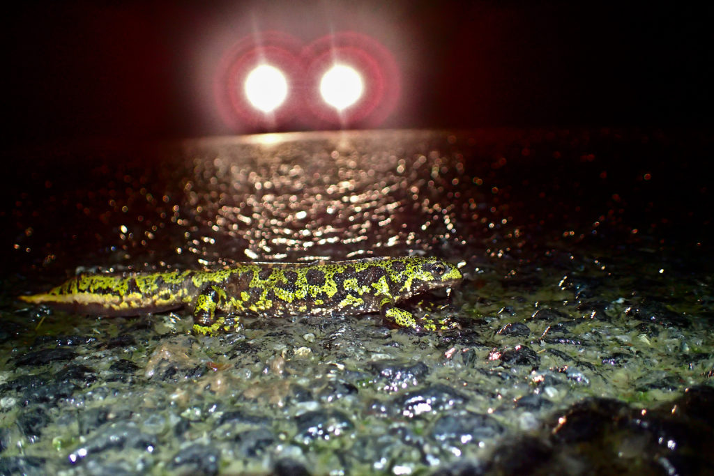 Avec le retour de la douceur et l’humidité, les crapauds, grenouilles, tritons et autres amphibiens vont entamer leur migration. Leur mode de vie biphasique les oblige à se déplacer de leur lieu d’hibernation (bois, haies, fourrés, …) vers les zones de reproduction (mares et zones humides). Cette phase de migration prénuptiale est souvent la plus spectaculaire car pour certaines espèces, comme le Crapaud épineux, elle est concentrée dans le temps : tous les individus cherchent à rejoindre le site de reproduction au même moment. Pour y parvenir, ils sont obligés de franchir les obstacles qui se dressent devant eux. Les routes qui traversent leur chemin les amènent notamment à prendre de gros risques. Les amphibiens sont les vertébrés les plus touchés par les écrasements routiers, avec de 60 % à 90 % des cadavres récoltés. En France, cela représente 25 à 50 millions d’amphibiens tués chaque année selon une étude du CEREMA (2019). Les espèces les plus touchées sont généralement la Salamandre tachetée et le Crapaud épineux.