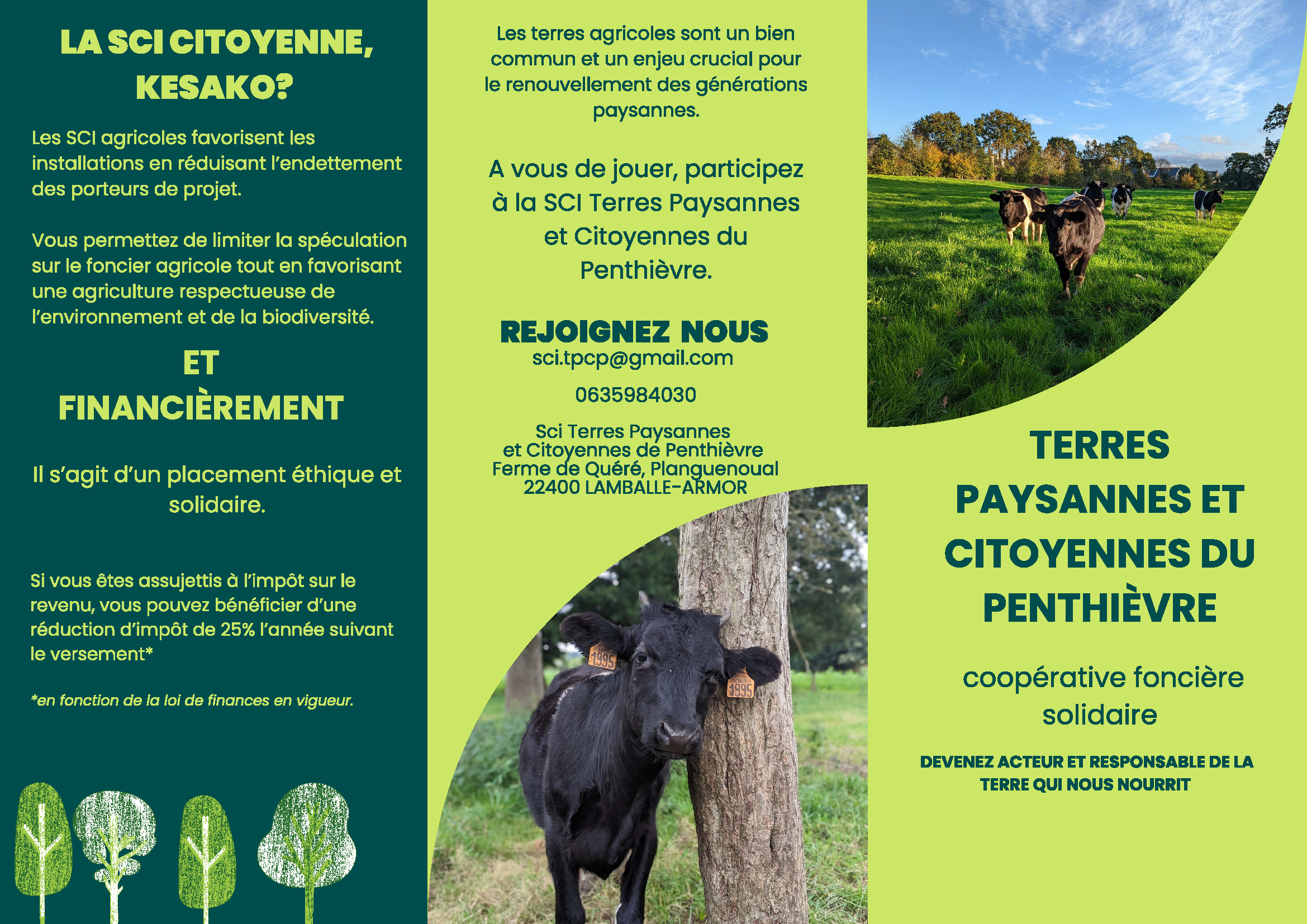 La SCI Terres Paysannes et Citoyennes du Penthièvre est un collectif de citoyens qui se sont associés pour acheter des champs et des fermes afin de permettre à des jeunes agriculteurs bio de s’installer en limitant leur endettement. En 2024, ils ont ainsi permis à Yoann Le Strat de reprendre une ferme laitière à Planguenoual, qui fait maintenant partie du réseau Paysans de nature.