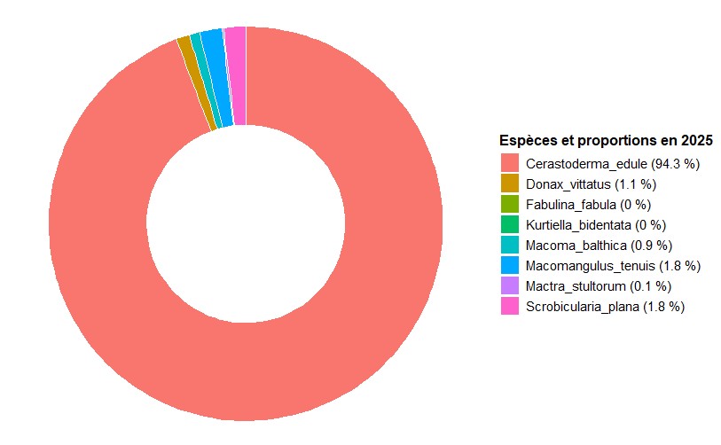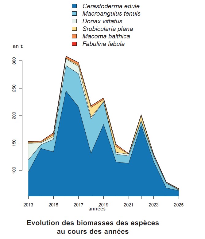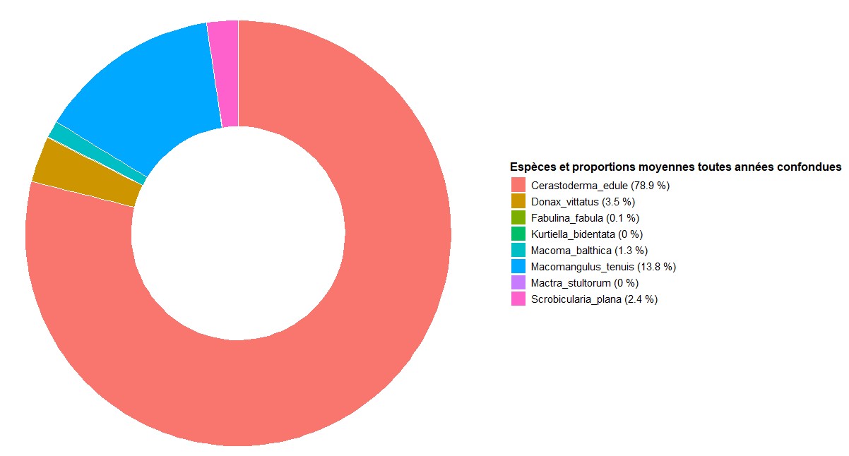 Cette année, la biomasse (le tonnage de matière organique au mètre carré) n’a jamais été aussi faible depuis le début du suivi, particulièrement pour les coques (Nom latin : Cerastoderma edule) qui représentent en moyenne quasiment 80% de la biomasse totale des bivalves (voir graphiques des proportions des 8 espèces principales, en cliquant sur les images).