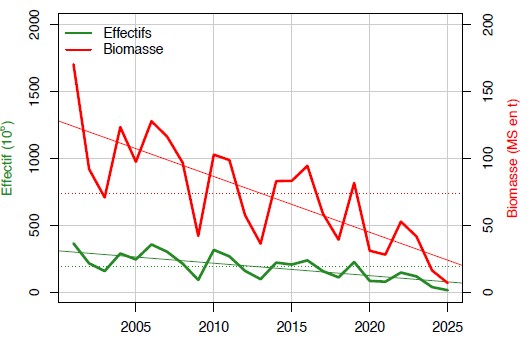 Cette diminution semble concerner l’ensemble des espèces, en particulier les trois principales : la coque (Cerasdorema edule), la telline papillon (Macomangulus tenuis) et la donace (Donax vittatus). Les graphiques suivant montrent les évolutions de biomasse au cours du temps depuis le début du suivi des bivalves en 2013 et de la coque en 2001. L’essentiel à voir sur ces graphiques, c’est la diminution des courbes ces dernières années ! La mortalité des coques observée ces dernières années concerne la classe d’âge adulte au dessus de 2.7 cm, soit la taille pêchable.