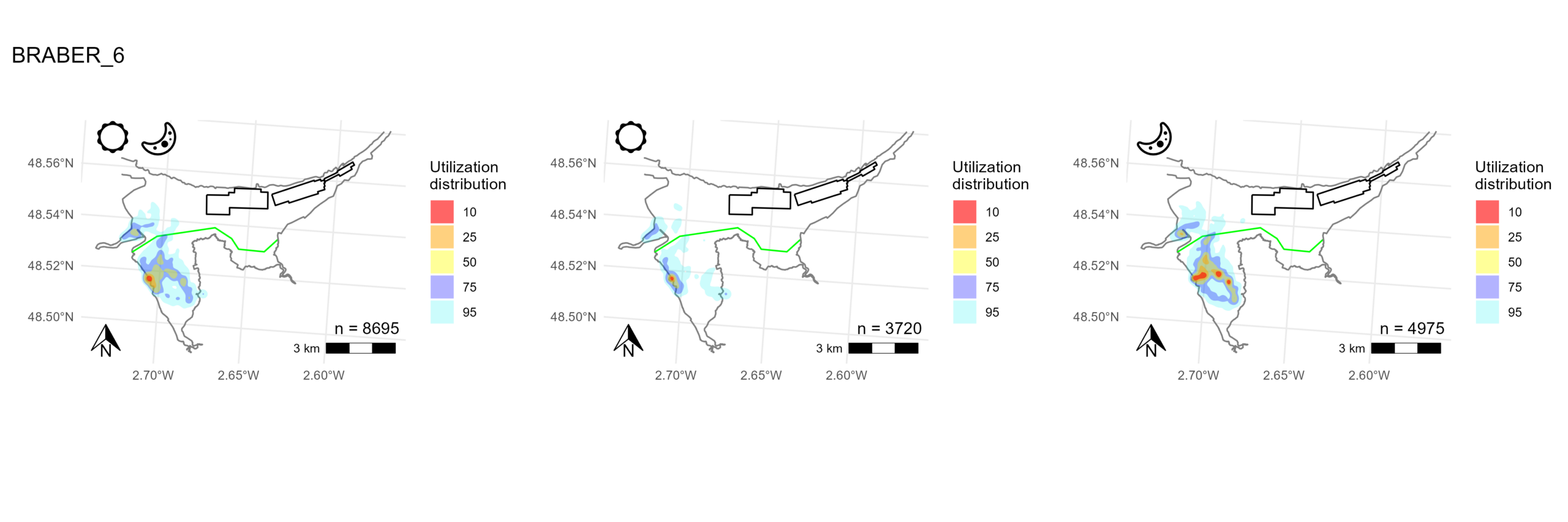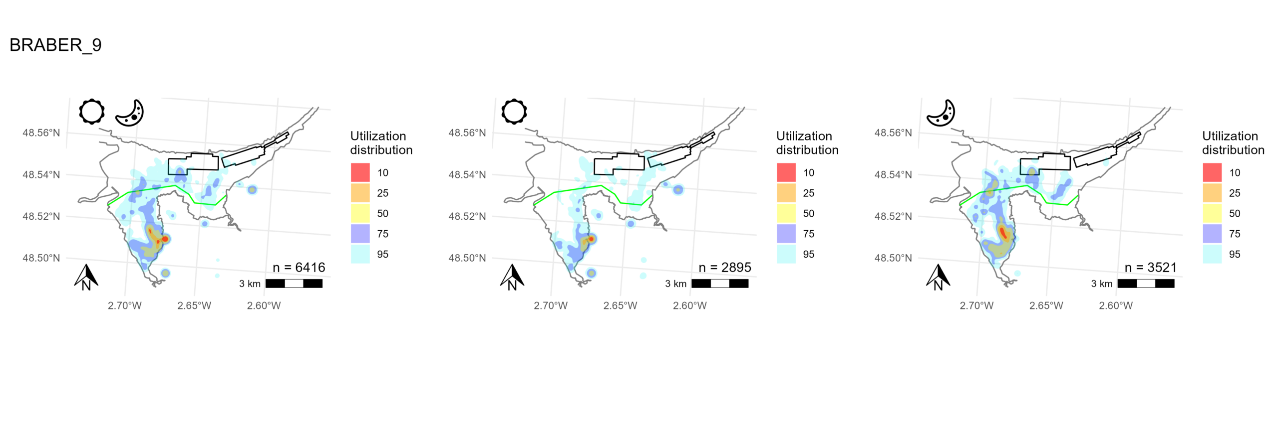 On observe que les zones d’utilisation sont plus étendues la nuit par rapport à la journée, et sortent du périmètre de la réserve (ligne verte), voire se situent dans la zone des bouchots (rectangles noirs).